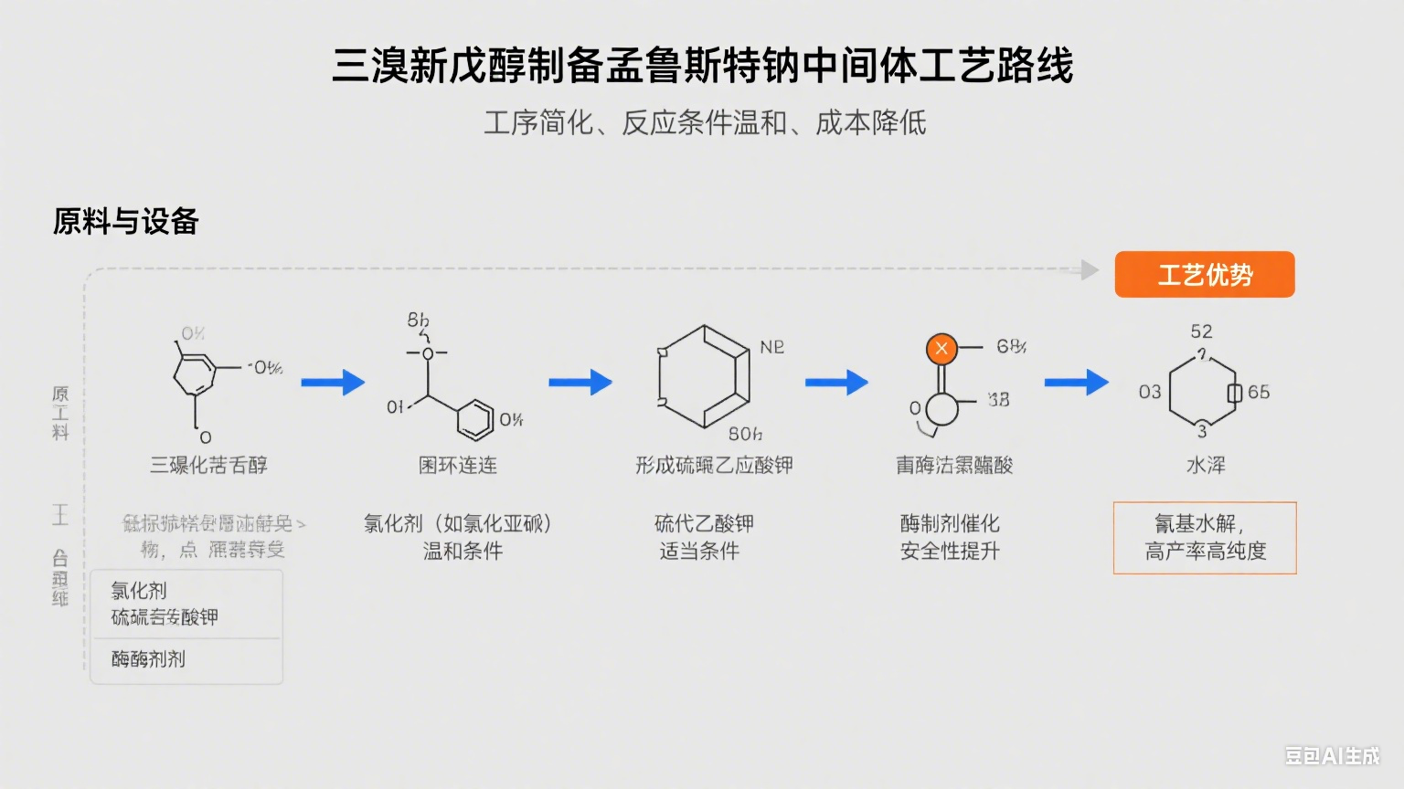 孟魯斯特鈉(Montelukast Sodium)是一種用于治 療哮 喘和過敏性鼻炎的有 效**,其中間體的制備對其** 終產物的質量和生產成本具有重要影響。本文介紹了一種通過三溴新戊醇合成孟魯斯特鈉中間體的工藝方法。與傳統(tǒng)方法相比,該工藝具有工序簡化、反應條件溫和、原料成本降低等優(yōu)點,為孟魯斯特鈉的工業(yè)化生產提供了一條高 效、經濟的路線。